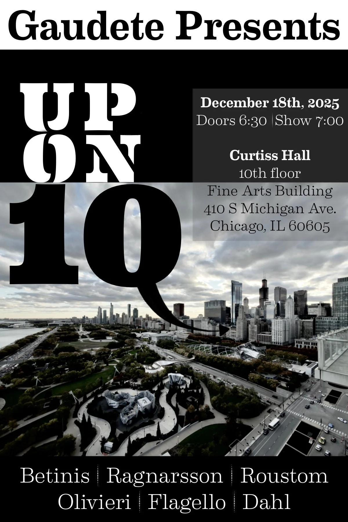 Join the Gaudete Brass for our annual concert “Up on 10” in the historic Fine Arts Building’s 10th floor Curtiss Hall. We will share innovative programming along with drinks and snacks in an informal concert featuring newest quintet by Gala Flagello, plus chamber music by Kareem Roustom and Mark Olivieri. We will also feature our special guests, the Brass Hoppers, from the University of Illinois to open the concert! Be a part of our yearly celebration of the best of chamber music in the heart of Chicago.